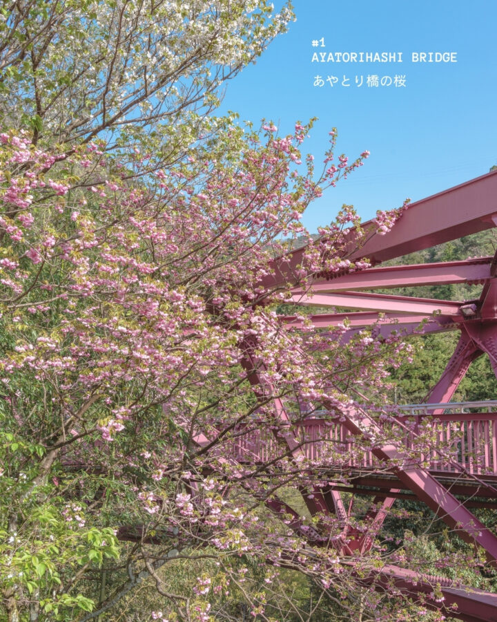 鶴仙渓の渓谷に咲く桜と、斬新なあやとり橋が重なります。芭蕉も愛した湯の里ならではの春景色。